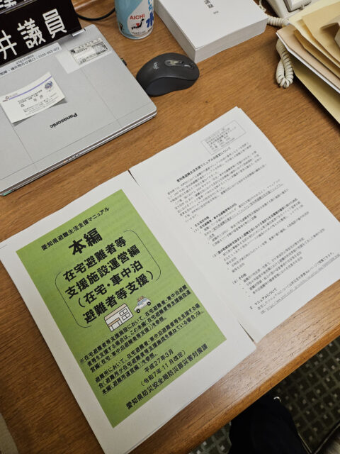 2025年11月29日 今年の2月議会で県に提案した市町村の災害対応マニュアルの充実支援について、この度新たに車中泊、自宅避難者への支援拠点(公民館等)の運営マニュアルが完成しました。 森井の今 今後も県内市町村の災害対策の充実に取り組んでまいります。 コメントを残す コメントをキャンセルメールアドレスが公開されることはありません。 ※ が付いている欄は必須項目ですコメント ※ 名前 ※ メール ※ サイト 次回のコメントで使用するためブラウザーに自分の名前、メールアドレス、サイトを保存する。 reCaptcha の認証期間が終了しました。ページを再読み込みしてください。 Δ